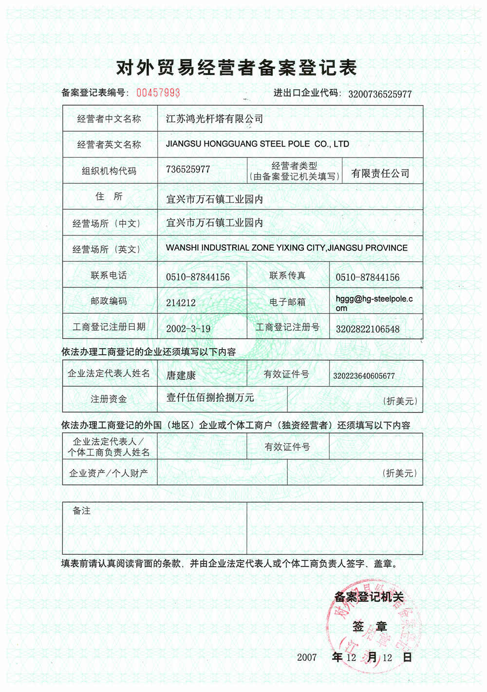 Ιδρύθηκε το 1998, η Jiangsu Hongguang Steel Pole Co. Ltd (Hg Steel Pole) ειδικεύεται στην κατασκευή διαφόρων πόλων χάλυβα. Κατασκευάζουμε μια ποικιλία από χαλύβδινα προϊόντα, όπως οι πύργοι και οι πόλοι χάλυβα μετάδοσης και οι δομές υποσταθμών για τη βιομηχανία μετάδοσης ισχύος, τους υψηλούς ιστούς και τους πόλους φωτισμού δρόμου για φωτισμό, πόλους επικοινωνίας μικροκυμάτων για τη βιομηχανία τηλεπικοινωνιών, πόλους κυκλοφορίας και πόλους CCTV.